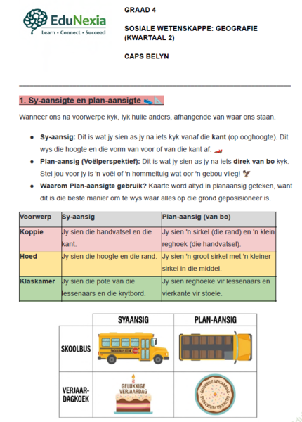 Geografie (Sosiale Wetenskappe): Sy- en planaansigte, simbole en sleutels, roosterverwysings, kompasrigtings en die kaart van Suid-Afrika.