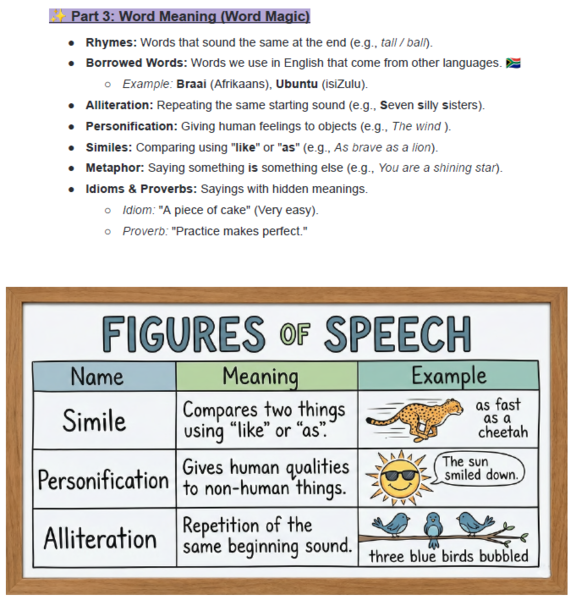 English First Additional Language (FAL): Nouns (concrete, abstract, compound), verbs, tenses, figures of speech, and sentence structure.