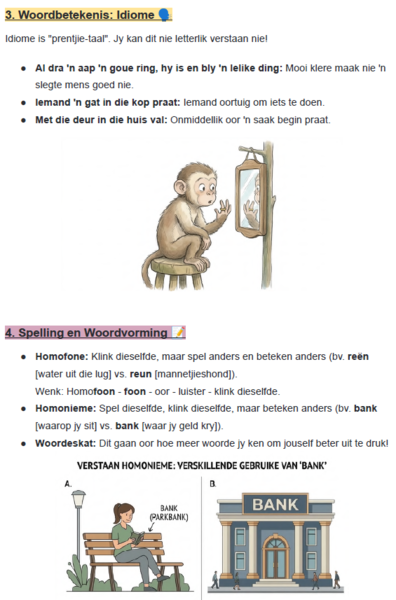 Afrikaans Huistaal – Woordvlakwerk (voornaamwoorde, morfologie), sinsvlakwerk (sinsontleding, tydsvorme), idiome en spelling.