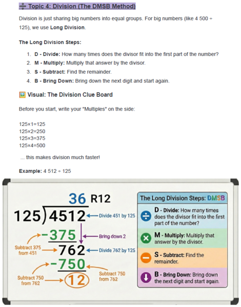 Topic 4: Long Division (The DMSB Method) – A visual "Clue Board" to help learners master the Divide, Multiply, Subtract, and Bring Down method.
