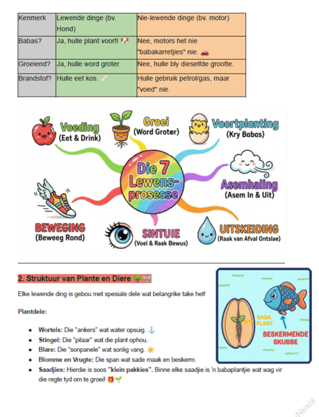 Lewende en Nie-lewende Dinge: Verduideliking van die 7 lewensprosesse (Voeding, Groei, Reproduksie, ens.) met visuele breinkaarte.